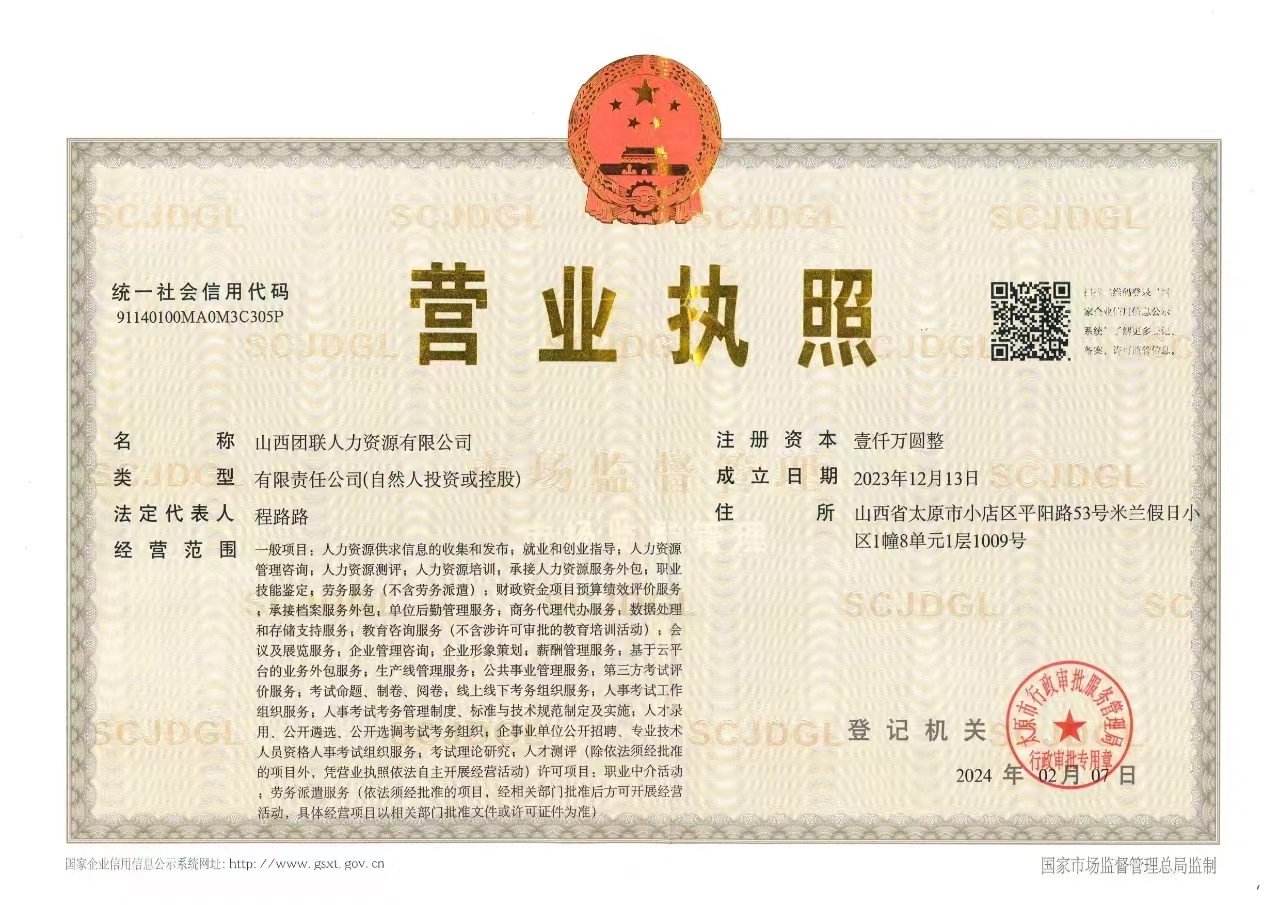 山西團聯(lián)人力資源有限公司是經太原市市場監(jiān)督管理局核準的可以獨立從事第三方考試服務的專業(yè)機構,涉及考試命題,制卷,閱卷;企事業(yè)單位的招聘,人事考試組織,人才錄用,公開遴選,公開選調考試組織,線上線下考務組織等。同時具有山西省人力資源和社會保障廳批準的勞務派遣經營許可證,人力資源服務許可證。